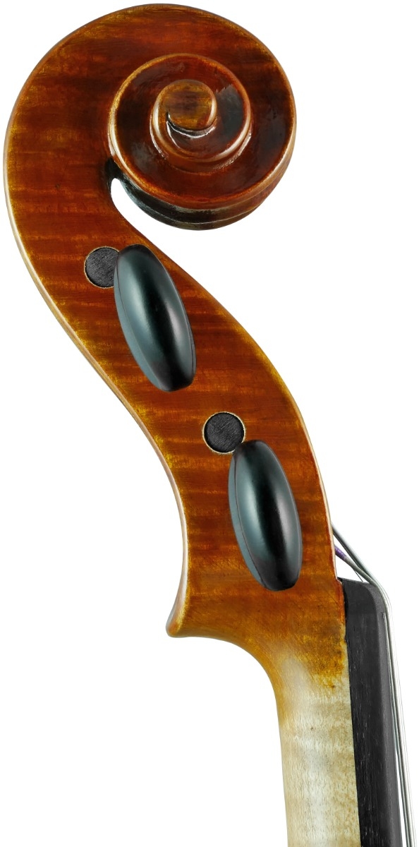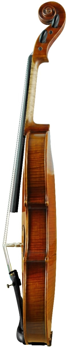 The finely grained spruce top and one-piece maple back reflect Stradivari’s hallmark craftsmanship, enhanced by a hand-applied oil varnish that reveals a warm golden-amber glow and delicate horizontal flame. Inspired by the Cremonese model, the design balances graceful contours with precise arching to deliver both visual and tonal sophistication.